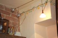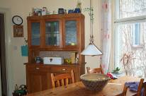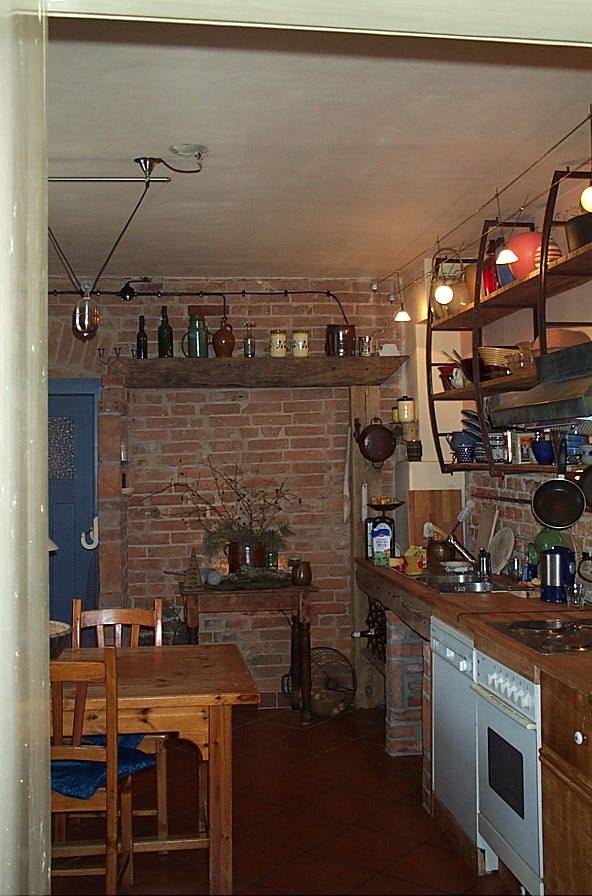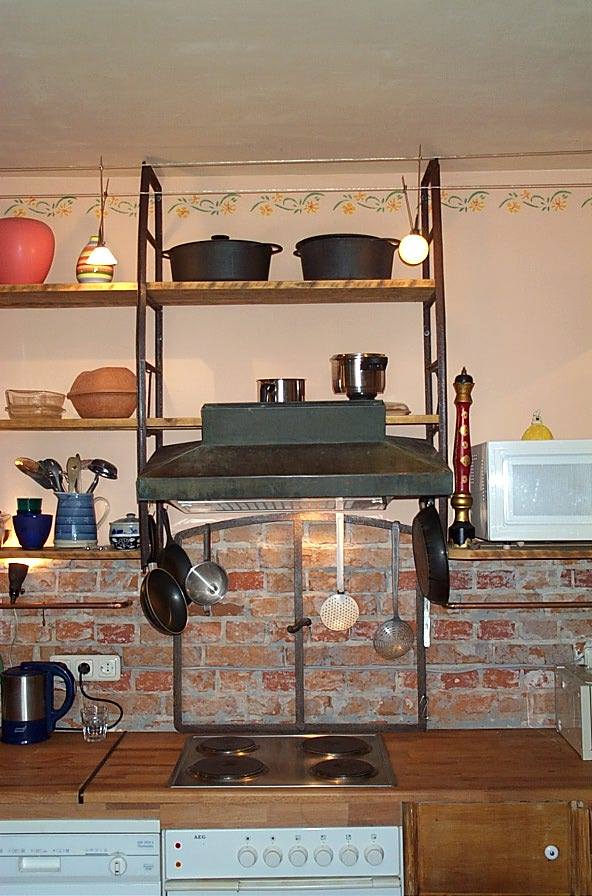 Da die Küche ja in vielen Häusern einer der Wohnraummittelpunkte ist, sollte in dieser Küche ein neues, gemütliches Ambiente Einzug halten. Auf konventionelle Küchenmöbel haben wir komplett verzichtet und ein durchdachtes Regalsystem aufgebaut in dem alles Griffbereit ist und ein Dunstabzug untergebracht ist. Die Küchentechnik wurde in den Arbeitsbereich integriert.