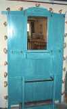 Diese Garderobe aus der Zeit des Jugendstil war ursprünglich mal Eiche funiert. Sie wurde im Laufe der Jahre weiß übergestrichen. Wir haben darüber jetzt eine blaue Farbe aufgetragen, und das Weiß wie eine Unterlasur durchschimmern lassen. Die 8 Messinghaken sind original, ebenso der Spiegel.