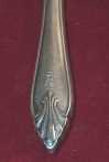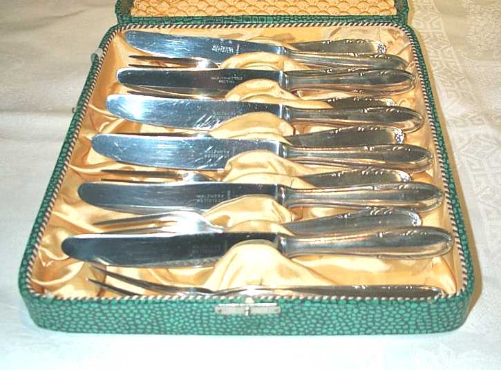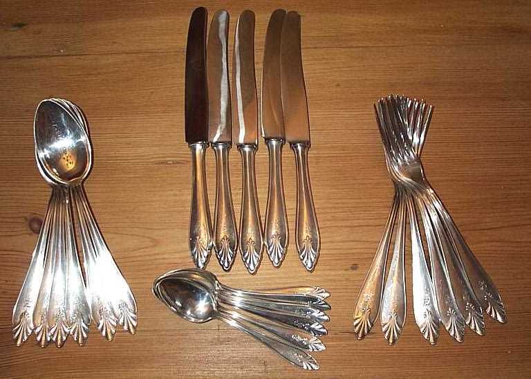 Essbesteck für 6 GedeckeGabel, Messer, Suppenlöffel und Dessertlöffel. 1 Messer fehlt. Mit Monogramm “EZ”. Fächermuster Klingenlänge 13,5cm