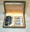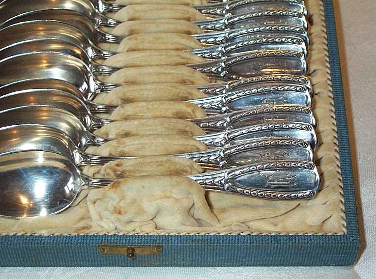Satz aus 12 Kaffeelöffeln Jugendstil, 800 Silber, gestempelt m. Krone und Halbmond. In Originalschatulle. Blau mit gelbem Samt.