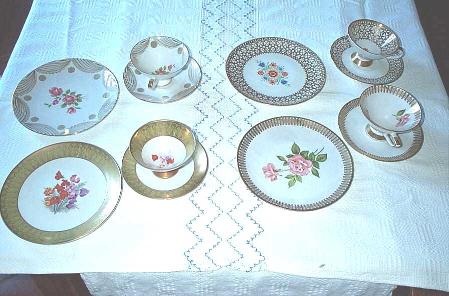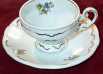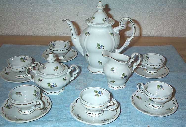 Schönes zierliches Moccaservice 6 Tassen m. Untertassen, Sahnegießer, Zuckerdose und kleiner Moccakanne. Tolle Form, weiß mit kleinen Blüten.
