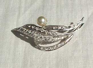 Silberfarbene Brosche in Blattform mit einer Zuchtperle.